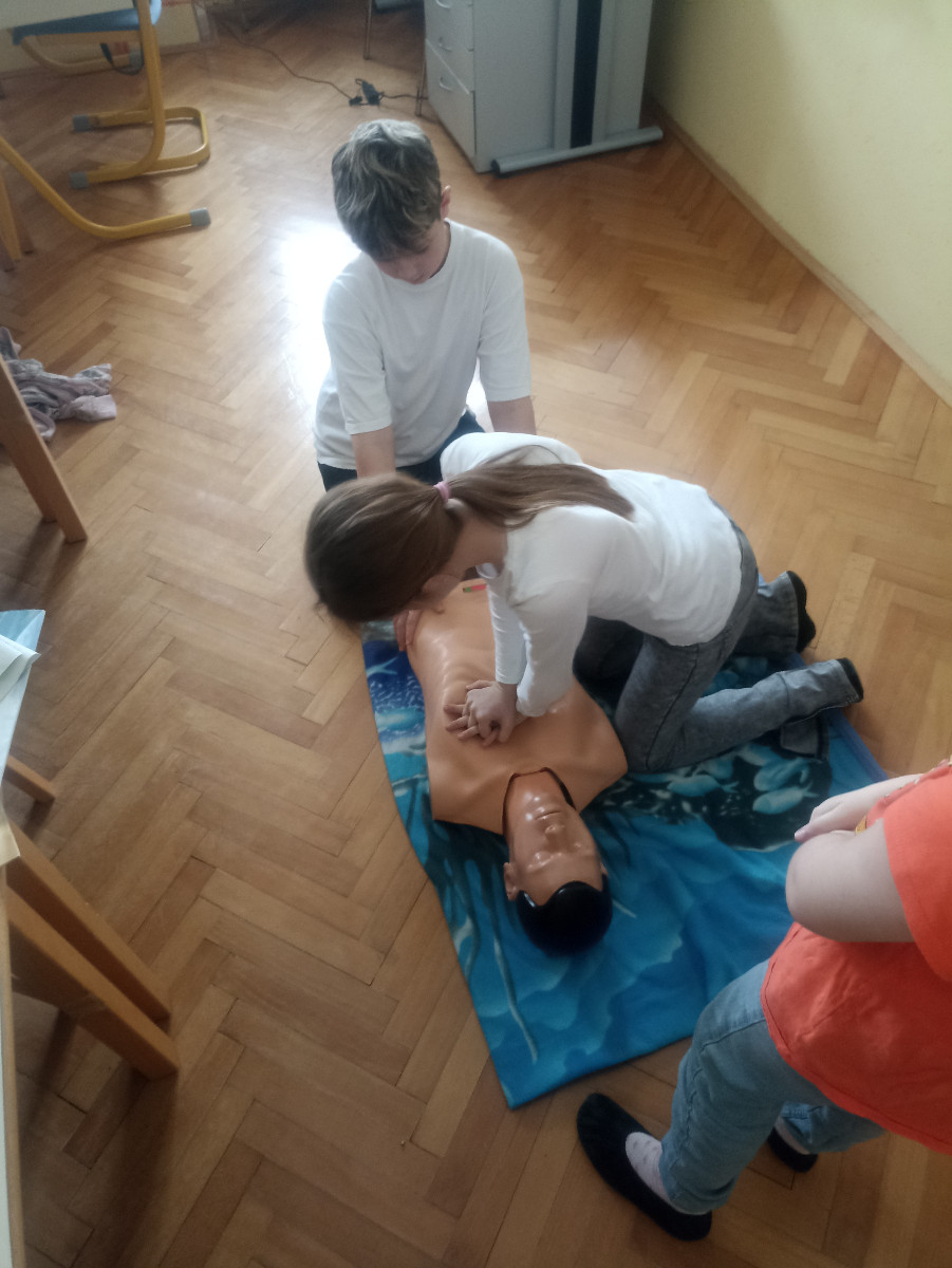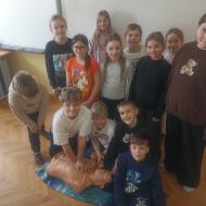 Danes je v 5. razredu pri razredni uri potekala predstavitev prve pomoči s poudarkom na oživljanju. Trije naši učenci (Neža, Filip in Gal), ki ob ponedeljkih obiskujejo RAP Prva pomoč, so na lutki prikazali temeljne postopke oživljanja. S pomočjo učiteljice Janje Pihler, so nam predstavili pravilno ukrepanje v nujnih primerih.
