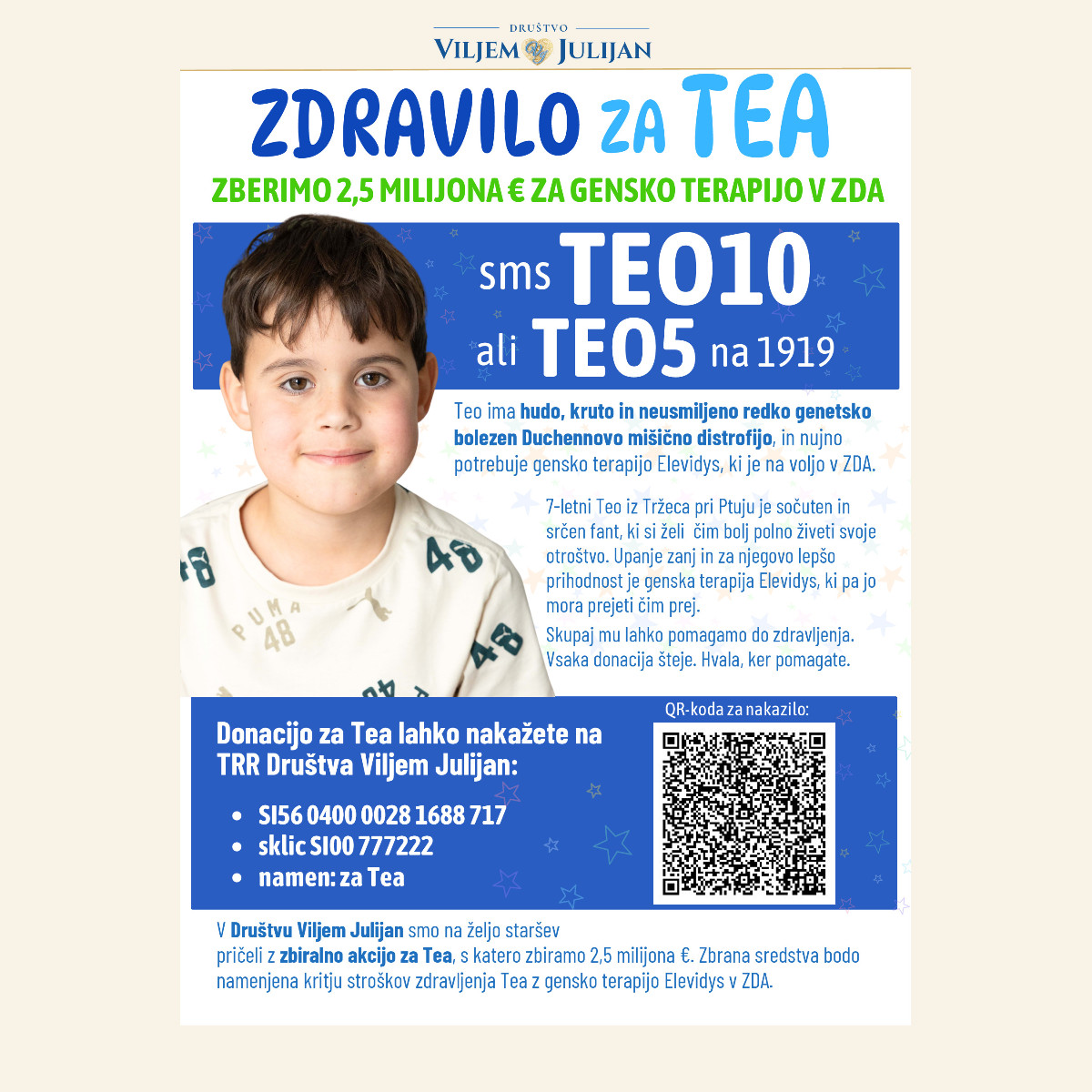 Ponovno nas vabijo, da po svojih močeh pomagamo. Kot ste verjetno že zasledili v medijih, je Teo učenec 2. razreda in je deček z redko genetsko boleznijo. Zdravljenje, ki mu lahko pomaga, obstaja, vendar je zanj treba zbrati 2,5 milijona evrov, saj ga naš zdravstveni sistem ne krije. Gre za zdravljenje v tujini, ki družini predstavlja izjemno veliko breme, zato potrebuje podporo širše skupnosti. Slovenci smo že večkrat dokazali, da znamo sodelovati in stopiti skupaj.