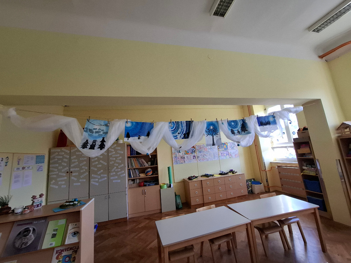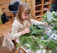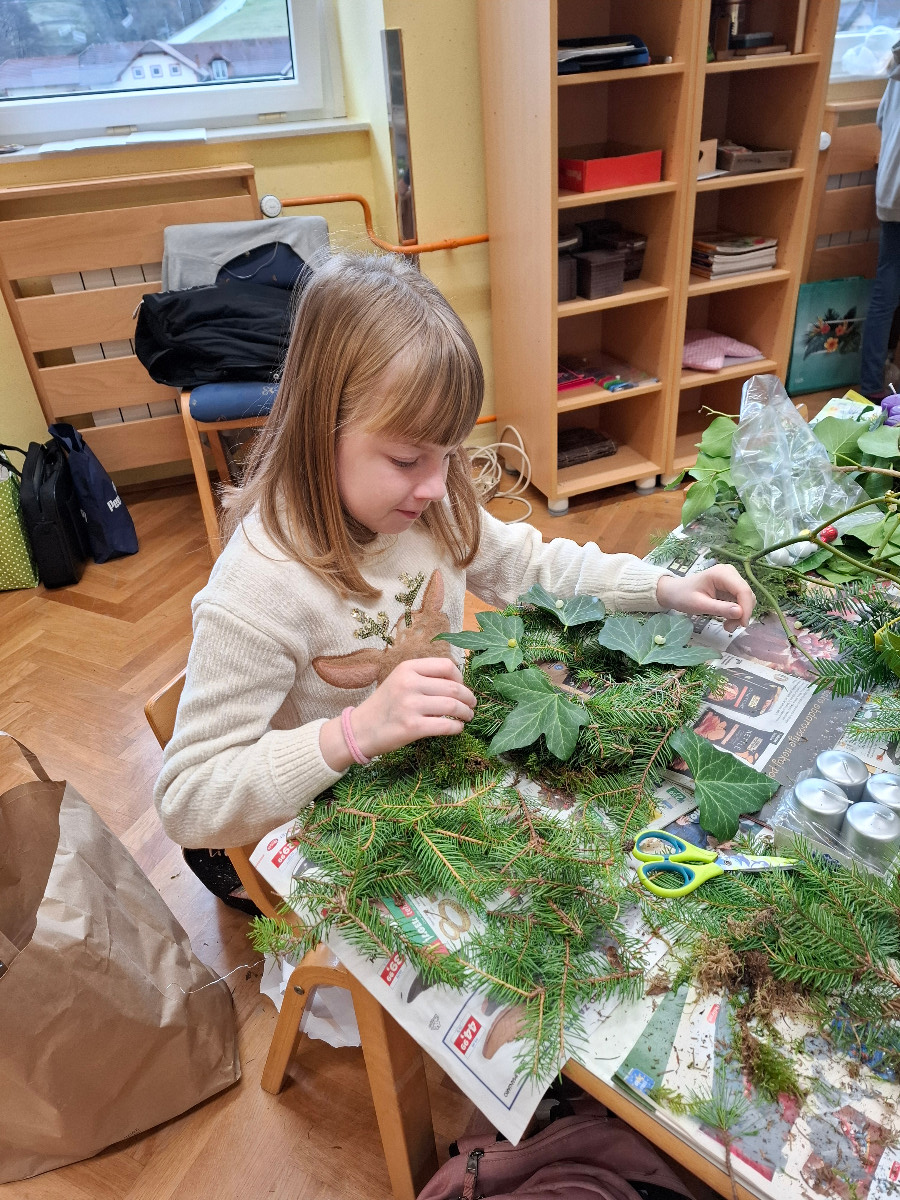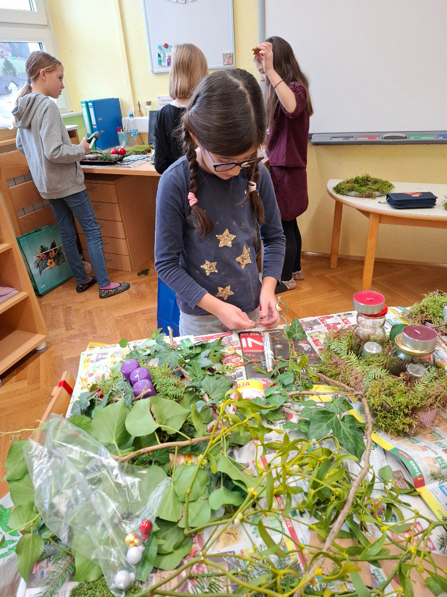 V ponedeljek, 8. decembra, so se četrtošolci veselili božično novoletne ustvarjalnice. Različni podstavki, mah, smrekove in borove vejice, bršljan in storži ter različni pisani okraski so pričarali dekoracije, ki samo še čakajo, da bodo lahko krasile mize naših učencev. Da bo veseli december še bolj prazničen in čaroben, so slikali zimske motive in si okrasili učilnici. Nekateri so našli čas še za izdelavo domiselne novoletne voščilnice.