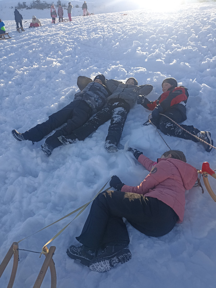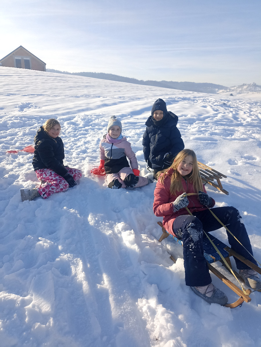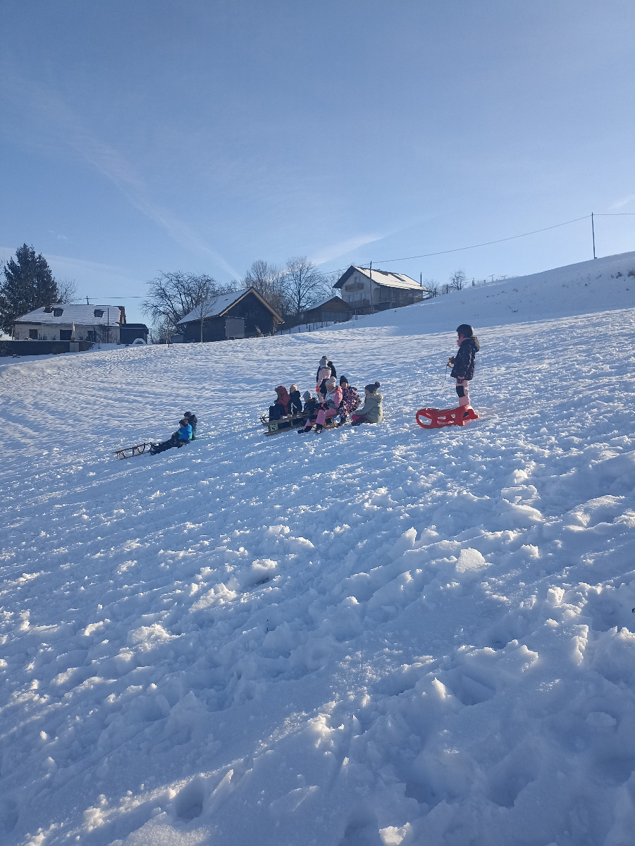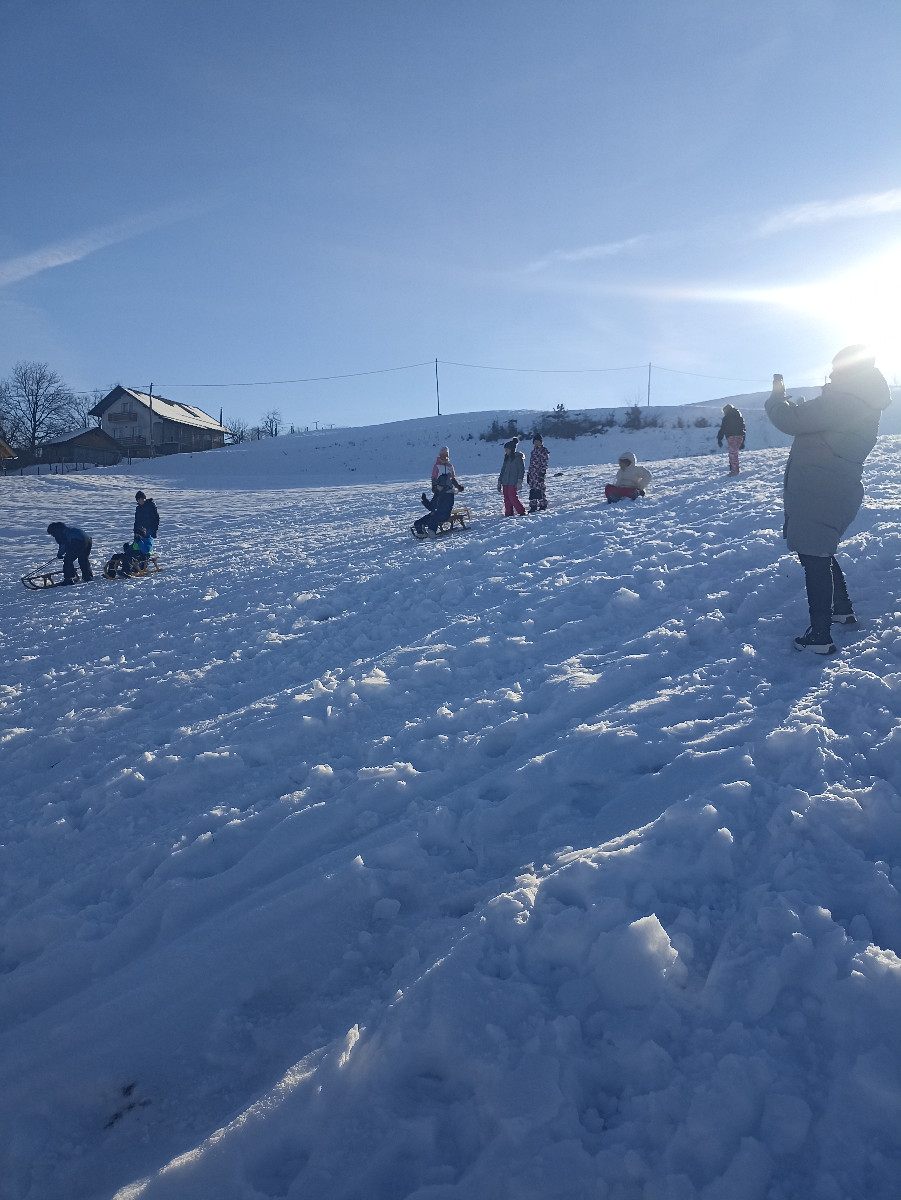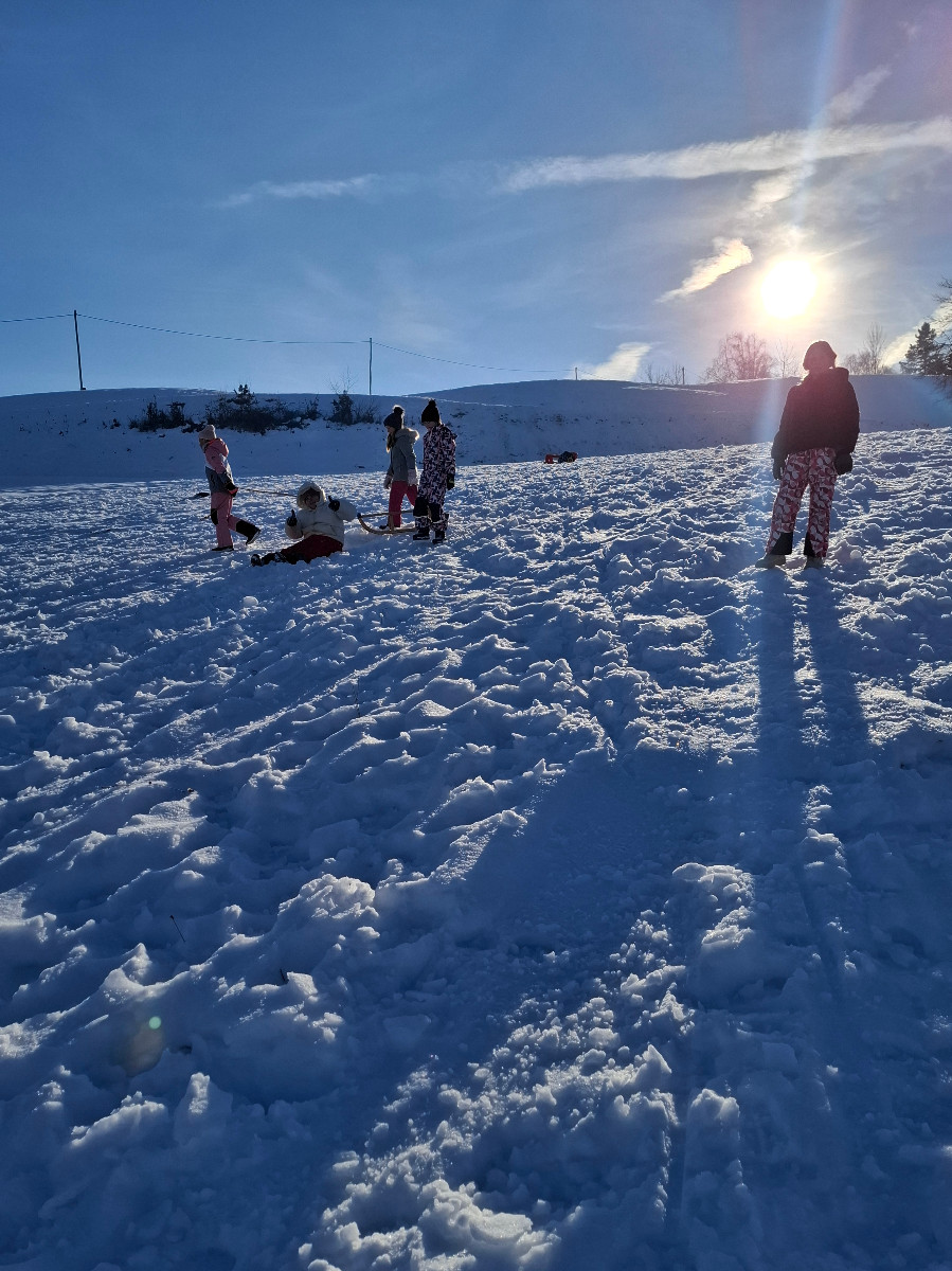 Snežna belina in vabljivi sončni žarki so tudi četrtošolce privabili na bele griče, kjer so si resnično dali duška. Radostni otroški glasovi, smeh in kriki navdušenja so se slišali daleč naokoli. Razigrani igri tudi nizke temperature in padci niso bili kos. Še več snega, prosimo! Zima je zakon.