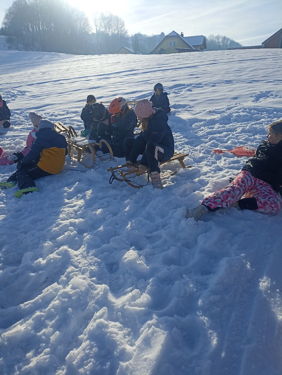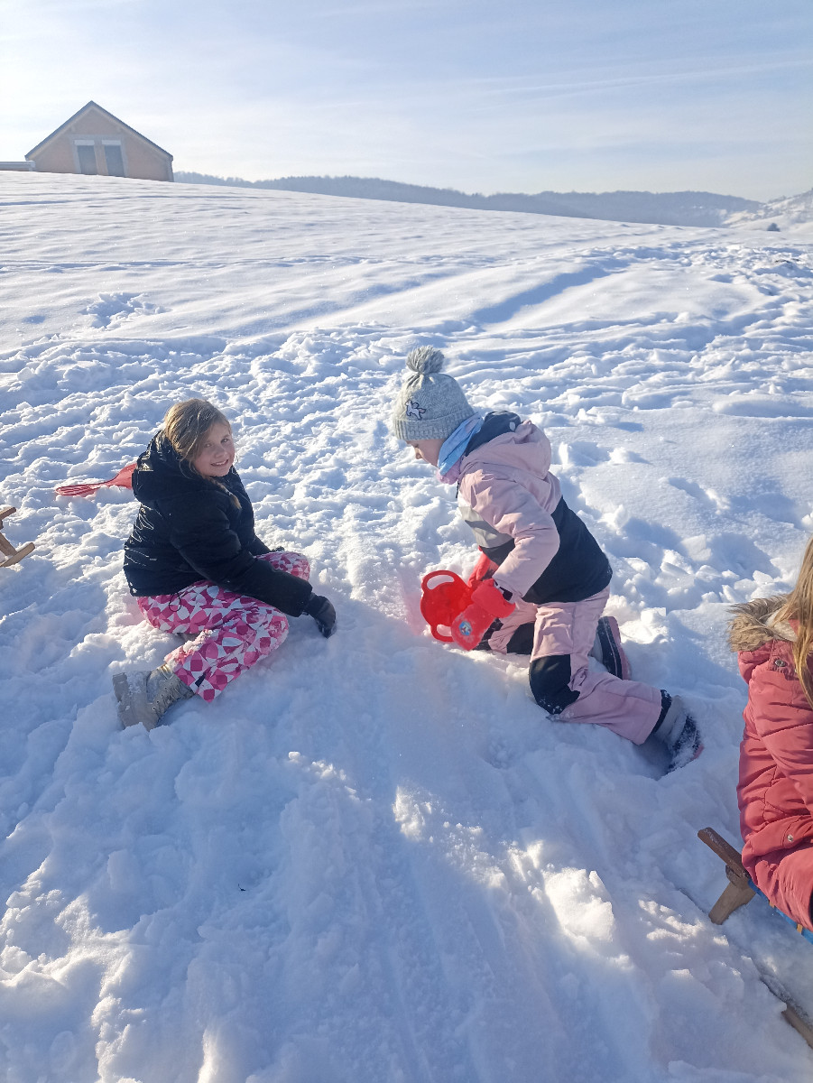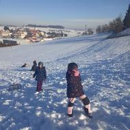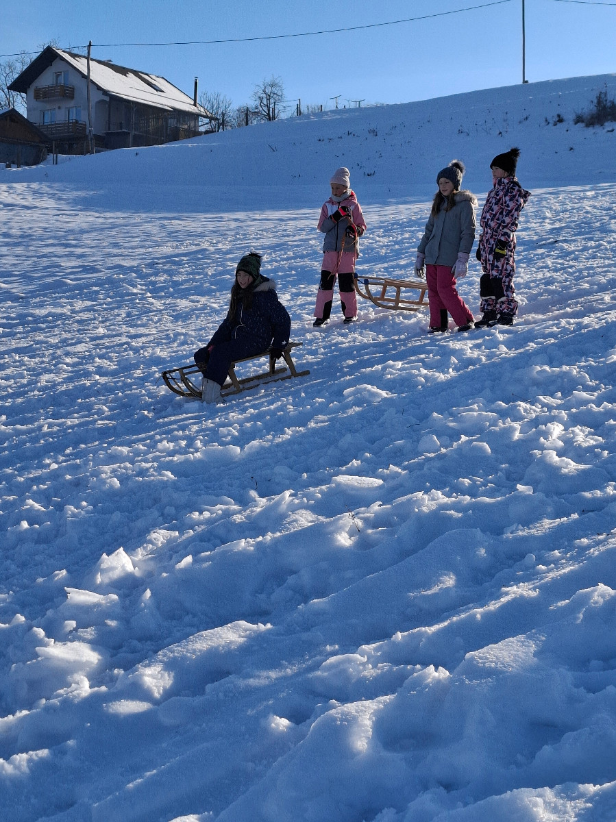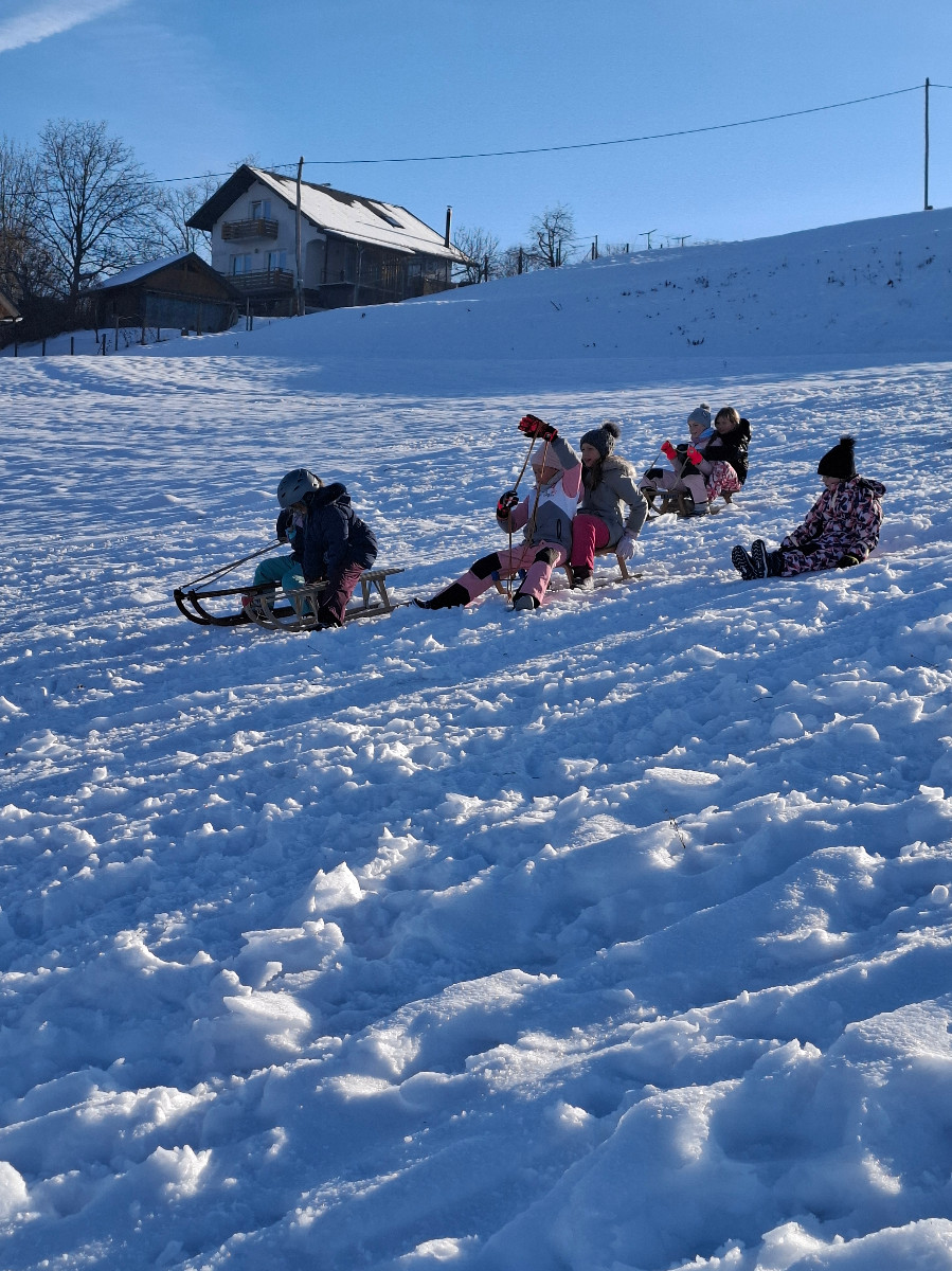 Snežna belina in vabljivi sončni žarki so tudi četrtošolce privabili na bele griče, kjer so si resnično dali duška. Radostni otroški glasovi, smeh in kriki navdušenja so se slišali daleč naokoli. Razigrani igri tudi nizke temperature in padci niso bili kos. Še več snega, prosimo! Zima je zakon.